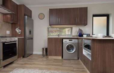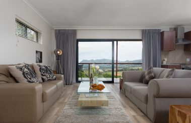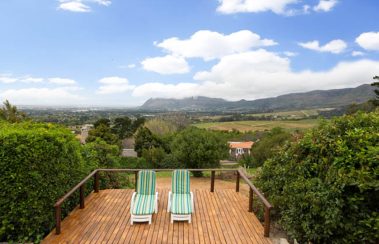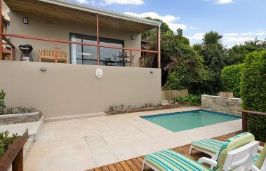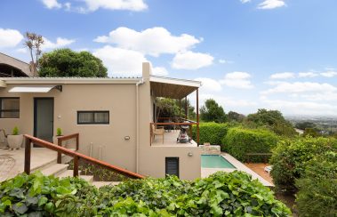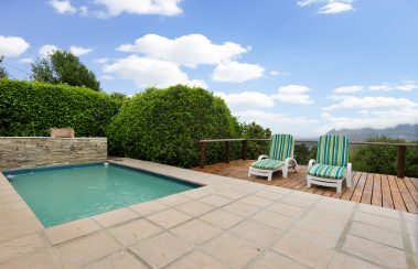 The spacious 85m² open plan living area includes lounge area, a queen size bed, fully equipped kitchen, gas fireplace and en suite bathroom. The large patio, complete with gas BBQ, boasts amazing views of the whole of Constantia Valley, over the sea to Gordons Bay. There is direct access to the main pool and splash pool – completing the perfect place to stay when visiting Cape Town.